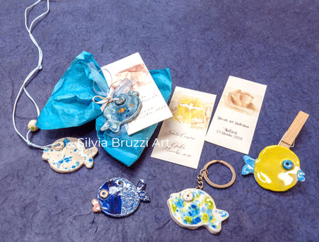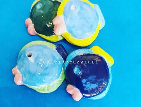 Pesci in ceramica modellate e decorate a mano con diverse tecniche pittoriche, leggere come un pensiero e ricche di colore. Perfette per ogni evento, diventano piccoli simboli di trasformazione, gioia e bellezza da donare